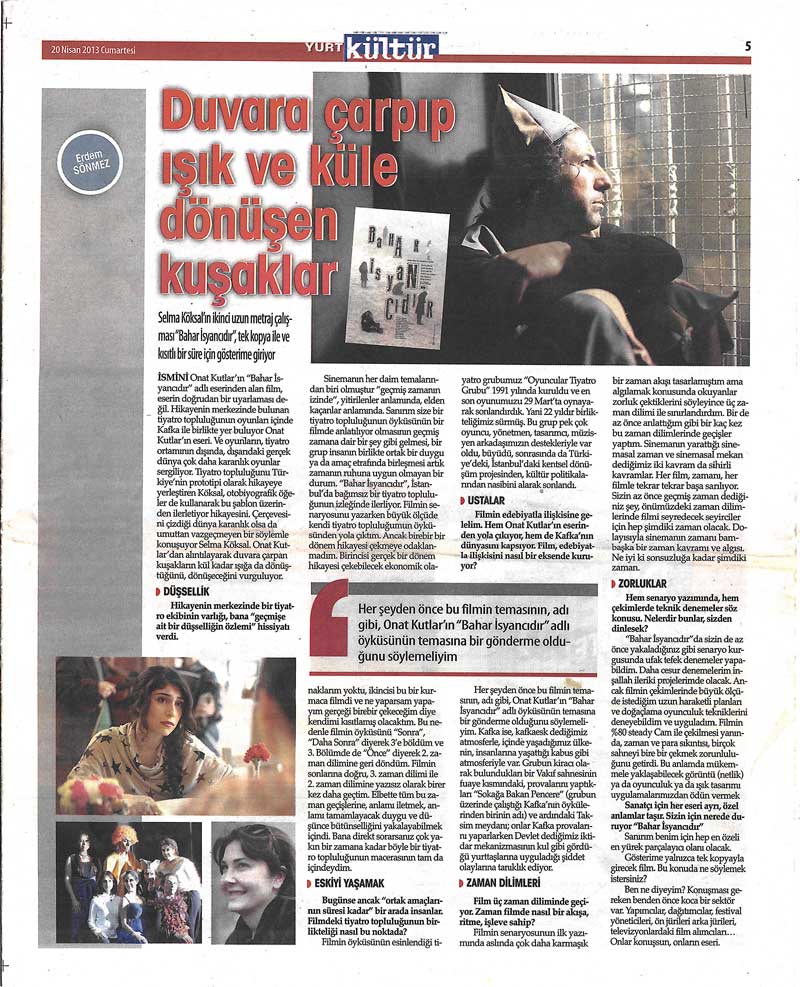 İSMİNİ Onat Kutlar’ın “Bahar İsyancıdır” adlı eserinden alan film, eserin doğrudan bir uyarlaması değil. Hikayenin merkezinde bulunan tiyatro topluluğunun oyunları içinde Kafka ile birlikte yer buluyor Onat Kutlar’ın eseri. Ve oyunların, tiyatro ortamının dışında, dışarıdaki gerçek dünya çok daha karanlık oyunlar sergiliyor. Tiyatro topluluğunu Türkiye’nin prototipi olarak hikayeye yerleştiren Köksal, otobiyografik öğeler de kullanarak bu şablon üzerinden ilerletiyor hikayesini. Çerçevesini çizdiği dünya karanlık olsa da umuttan vazgeçmeyen bir söylemle konuşuyor Selma Köksal. Onat Kutlar’dan alıntılayarak duvara çarpan kuşakların kül kadar ışığa da dönüştüğünü, dönüşeceğini vurguluyor.