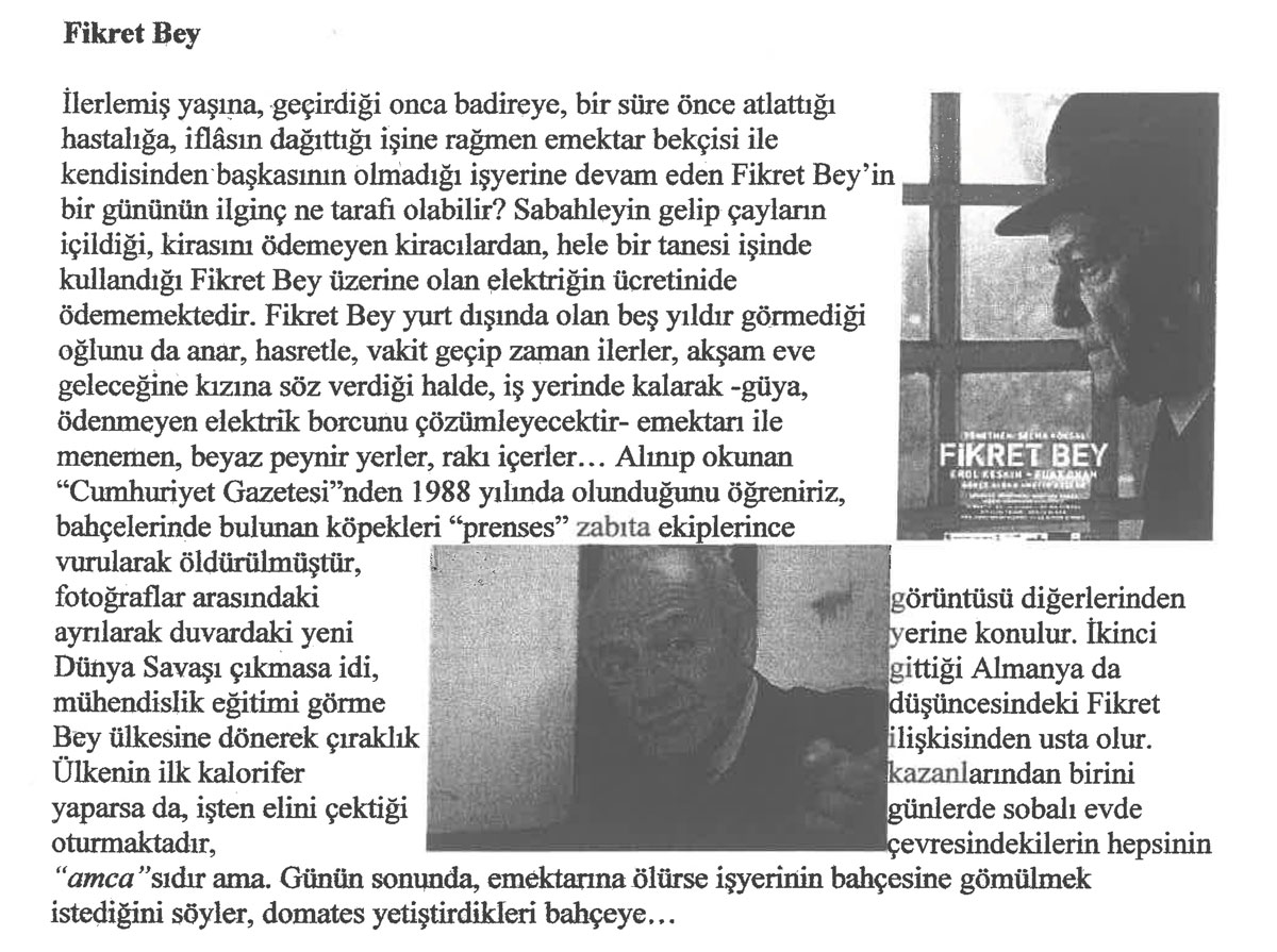 Fikret Bey gibi Fikret Bey filmi de -ne yazık ki- yalnız kalacak filmlerden biri sinemamızda; yalnız olmak (kalmak), hiç olmamaktan iyidir. İyi yalnızlıklar Fikret Bey. (Milliyet Sanat)